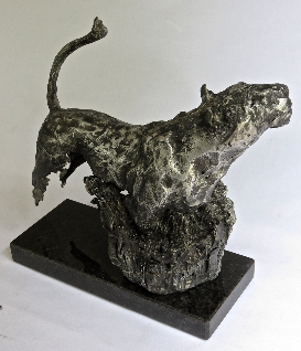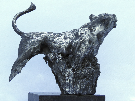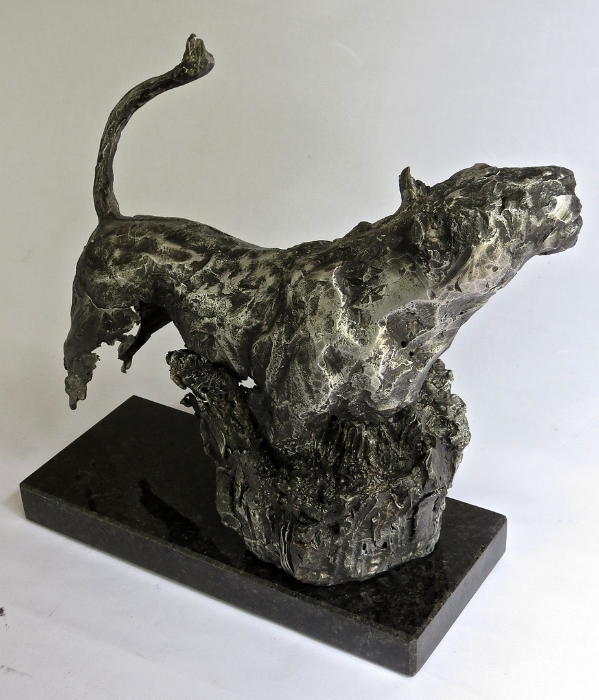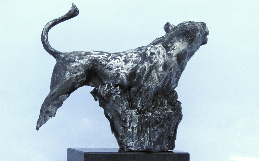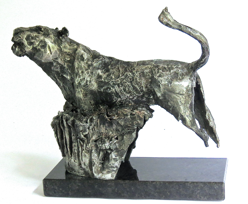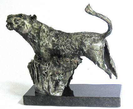 Original Pewter Sculpture depicting a lioness emerging from tall grass and scenting the air.